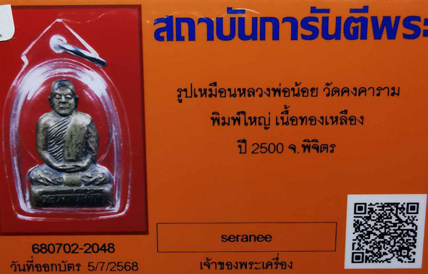 รูปเหมือนหลวงพ่อน้อย วัดคงคาราม เนื้อทองเหลือง ปี2500 จ.พิจิตร + บัตรG-pra สภาพเดิมค่ะ สภาพตามรูปทุกประการค่ะ