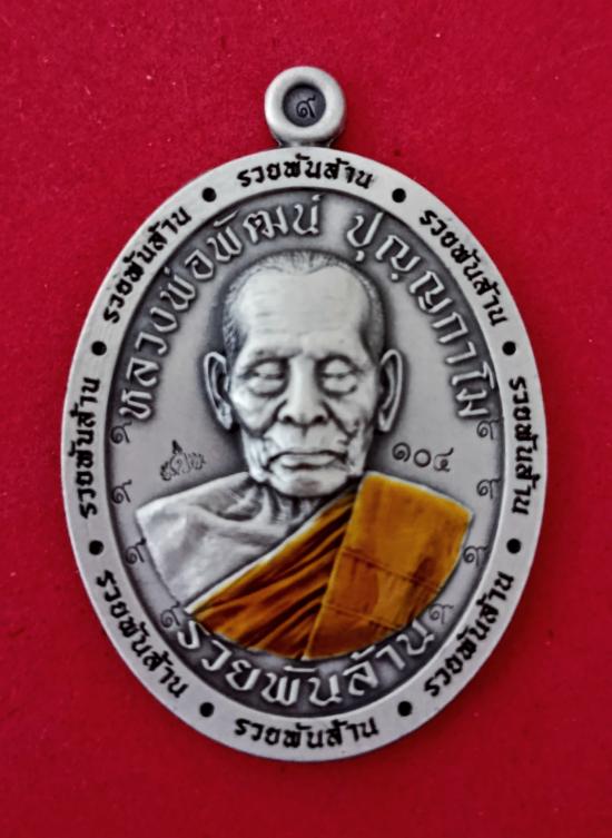 หลวงพ่อพัฒน์ เหรียญรุ่น รวยพันล้าน เนื้อเงินซาติน ลงยาจีวรเหลือง NO.๑๐๔ |