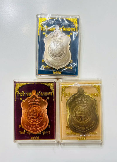 วัดใจ เหรียญเสมาที่ระลึกฉลองอายุวัฒนมงคล รุ่นครบ 7 รอบ หลวงพ่อโปร่ง โชติโก วัดถ้ำพรุตะเคียน จ.ชุมพร 3 เหรียญ