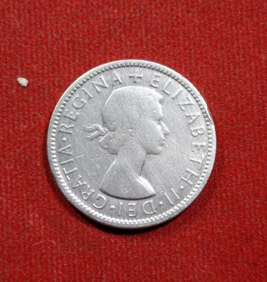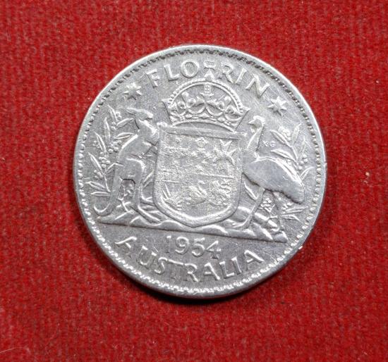 เหรียญฟลอริน (Florin) ของออสเตรเลียปี 1954 ซึ่งเป็นเหรียญที่ระลึกที่ผลิตขึ้นเพื่อเฉลิมฉลองการเสด็จเยือนออสเตรเลียของสมเด็จพระราชินีนาถเอลิซาเบธที่ 2 เนื้อเงิน50% |