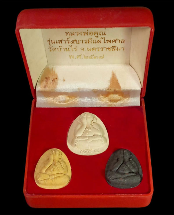 พระปิดตาชุดกล่อง ๓ องค์ ลพ.คูณ รุ่นเสาร์ ๕ บารมีแผ่ไพศาล ปี ๒๕๓๗ สอดตะกรุดเงินที่ขอบล่างทั้ง ๓ องค์ พระสวยนอนกล่องมาเดิมๆ ไม่เคยแกะใช้เลย เก็บอย่างเดียว พระสวยคมสมบูรณ์ทุกองค์ ปีลึกๆ แท้ทันหลวงพ่อคูณปลุกเสกแน่นอน |