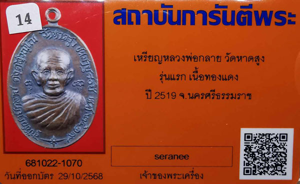 เหรียญหลวงพ่อกลาย วัดหาดสูง รุ่นแรก เนื้อทองแดง ปี2519 จ.นครศรีธรรมราช + บัตรG-pra สภาพเดิมค่ะ สภาพตามรูปทุกประการค่ะ