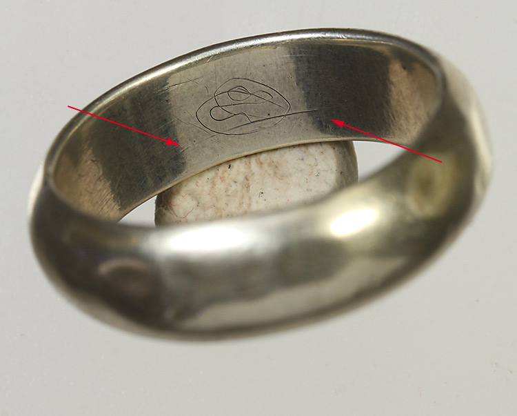วัดใจ**เครื่องราง แหวนปลอก*{ เนื้อเงิน 92.5 }*มีรอยจารเก่า ไม่ทราบที่ ไซร์64.....ตามสภาพครับ