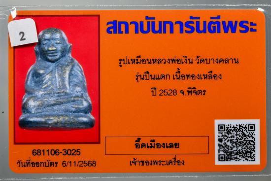 พระรูปหล่อโบราณ หลวงพ่อเงิน วัดบางคลาน รุ่นปืนแตก พิมพ์เศียรเล็ก เนื้อเก่า พ.ศ.2528 พร้อมบัตรรับรอง |