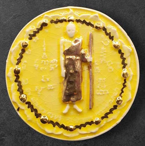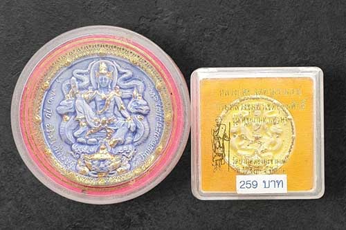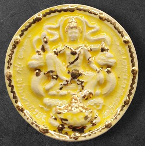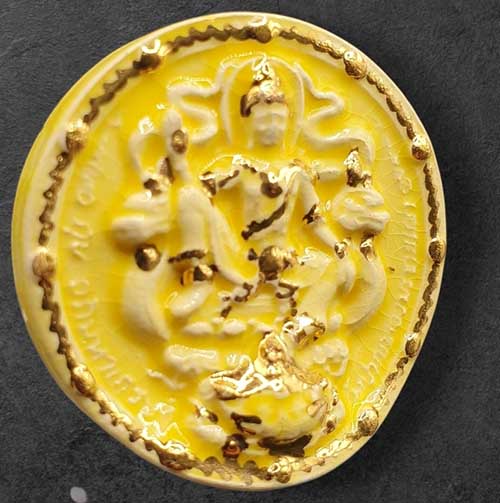 องค์พ่อจตุคาม หลวงปู่ศุข กรมหลวงชุมพร รุ่น ศุข อภิมหาเศรษฐี เนื้อกระเบื้องเคลือบ สีน้ำเงิน + สีเหลือง ลายน้ำทอง ขนาด 5 ซม และ 3 ซม.กล่องเดิม |