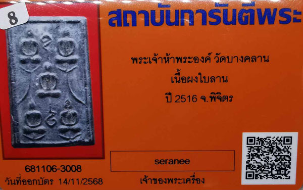 พระเจ้าห้าพระองค์ วัดบางคลาน เนื้อผงใบลาน ปี2516 จ.พิจิตร + บัตรG-pra สภาพเดิมค่ะ |