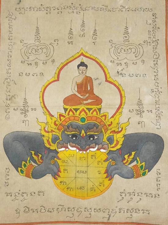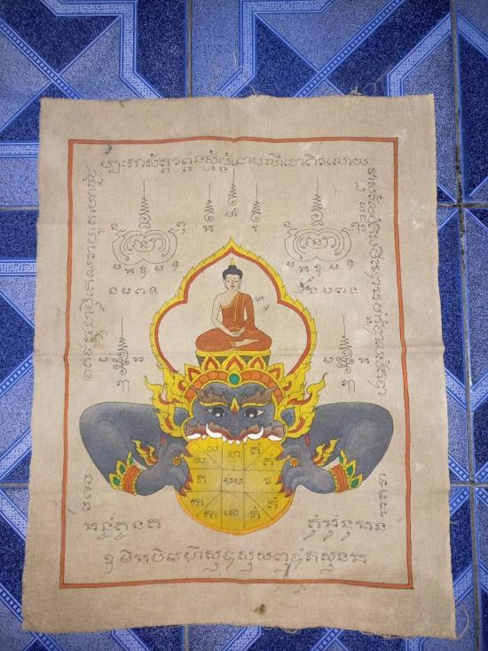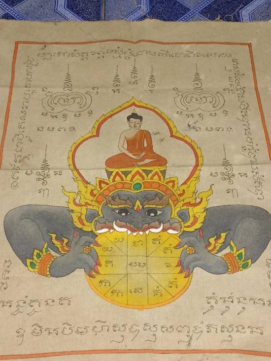 ผ้ายันต์ราหูอมจันทร์ สุดยอดงานพุทธศิลป์ ยุคใหม่ มนต์เสน่ห์แห่งเครื่องราง งานเขียนมือ ล้วนๆ ขนาด 44*57 ซม.. |