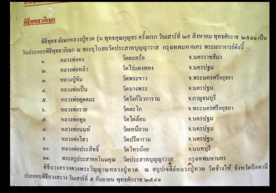 พระหลวงปู่ทวด มีการจัดสร้างอย่างเป็นทางการครั้งแรกเมื่อปี พ.ศ.2497 โดยอาจารย์ทิม อดีตเจ้าอาวาสวัดช้างไห้ นอกจากนี้แล้วแม้พระหลวงปู่ทวดที่สร้างจากวัดอื่นหรือพระที่พวกมือผีจงใจ ปลอมแปลงขึ้นมา หากผู้บูชามีศรัทธาในหลวงปู่ทวดอย่างแท้จริงก็สามารถก่อให้เกิดปาฏิหาริย์ เป็นอัศจรรย์ได้เช่นเดียวกัน ถือเป็นพระประเภทนิรันตราย ถือว่าประสบการณ์ชัดเจน มีประสบการณ์ด้านแคล้วคลาดจากอุบัติเหตุเป็นเลิศ ผู้ที่นับถือต่างพบเห็นประสบการณ์มากมาย จนมีคำพูดว่า แขวนพระหลวงปู่ทวดแล้วไม่ตายโหง หลวงพ่อทวด วัดช้างให้ จ.ปัตตานี รุ่นพุทธคุณกุญชร ปี 2541 เนื้อว่านผสมผงงาช้างแมมมอธ ตะกรุดเงิน ชุดกรรมการ 3 องค์ หมายเลข 1988 พร้อมกล่องเดิม |