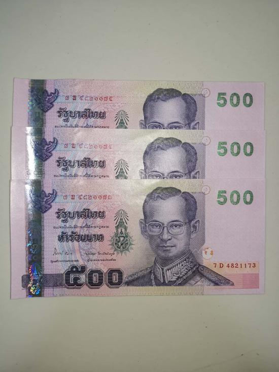 ธนบัตรรักาลที่ 9 ไม่ผ่านการใช้ ฉบับละ 500 บาท รวม 3 ฉบับ ตามรูปเคาะเดียว