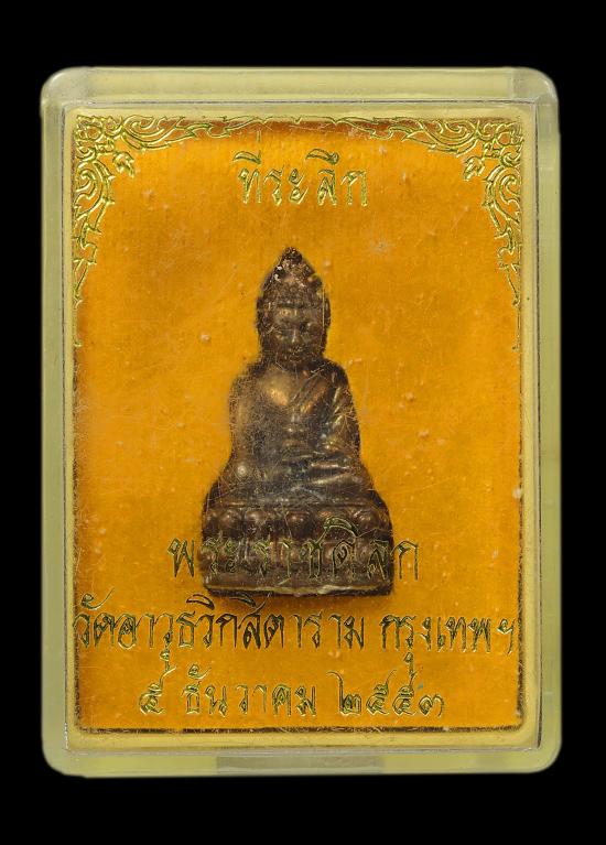 พระชัยวัฒน์พุทโธน้อย วัดอาวุธ กรุงเทพ เนื้อโลหะ ก้นอุดผงมวลสารเก่า ปี2553 เลข 1117 สวย กล่องเดิม สภาพสวยเดิม |