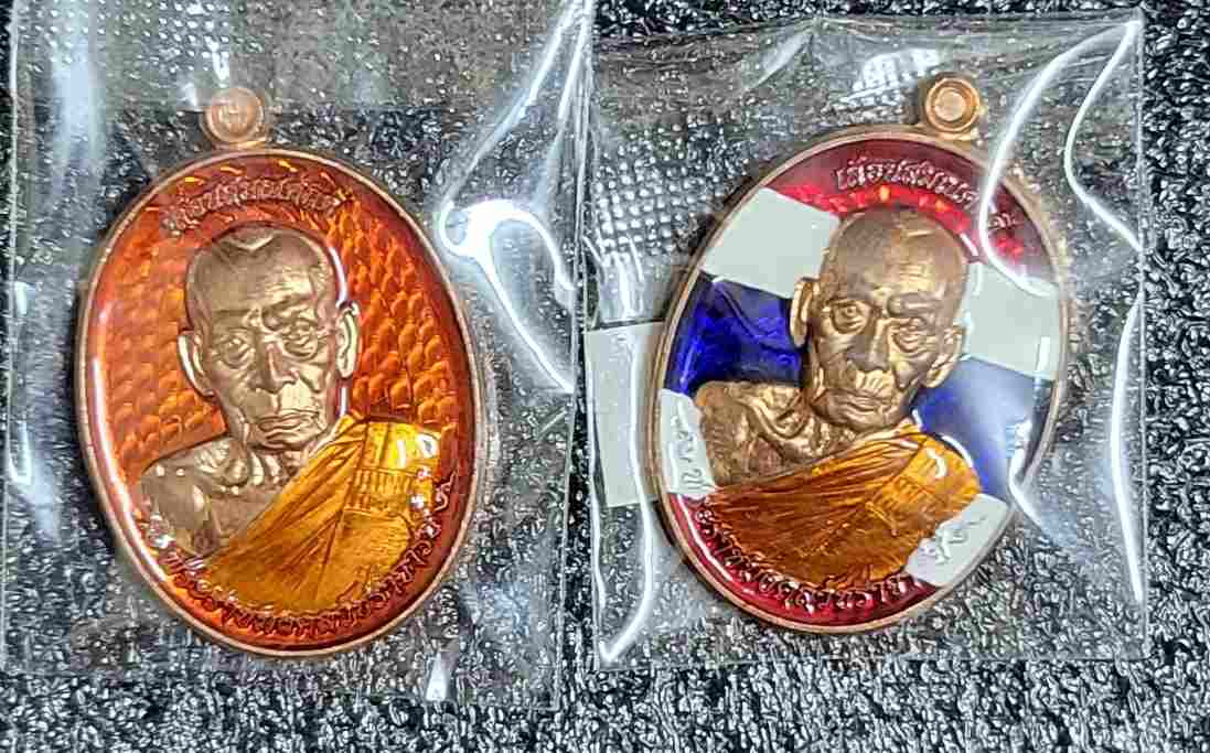 เคาะเดียวแดง เหรียญหลวงพ่อพัฒน์ รุ่นเลื่อนสมณศักดิ์ เนื้อทองแดงลงยา ลายธงชาติ และลงยาแดง ลงยาจีวร รวม 2 เหรียญ |