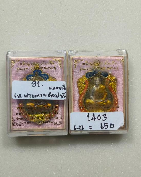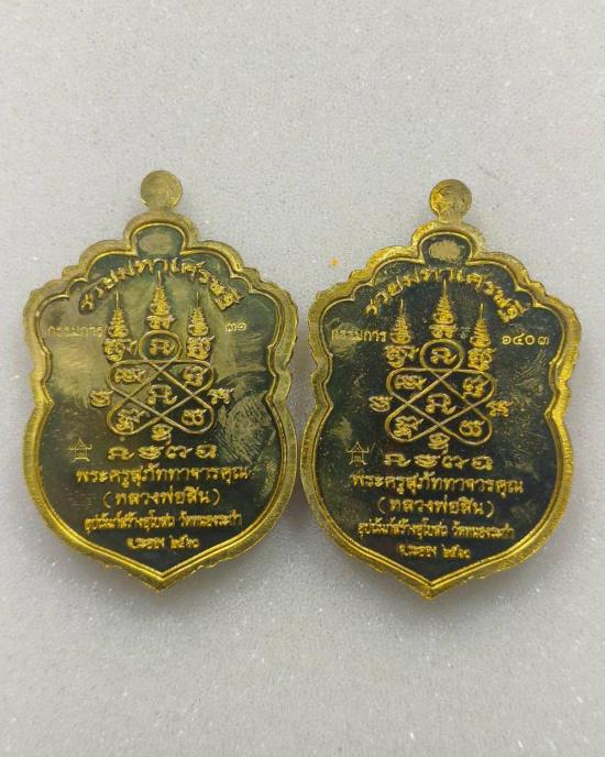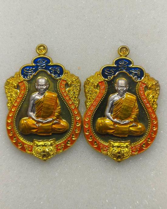 เสมาหัวเสือรุ่นแรก รวยมหาเศรษฐี(กรรมการ)เนื้อทองฝาบาตร หน้าอัลปาก้า ลงยา 3 สี จำนวน 2 องค์ หลวงพ่อสิน วัดละหารใหญ่ มีกล่อง แดงเคาะแรก |