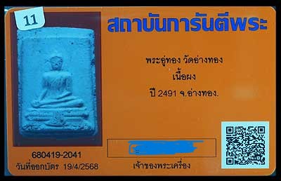 เป็นพระที่ใช้มวลสารสมเด็จโตพรพมรังสีล้วนโดยนำพระสมเด็จกรุวัดเกษไชโยที่ชำรุดแตกหักมาเป็นส่วนผสมหลักและพระสมเด็จกรุวัดระฆังที่ชำรุดแตกหัก ที่หลวงปู่นาคมอบให้แถมลูกศิษย์สายตรงสมเด็จโตมาร่วมอธิฐานจิตหลายเกจิคณาจารย์ได้แก่ หลวงปู่นาค วัดระฆัง เป็นต้น พระเนื้อผงพิมพ์อู่ทองพระประธาน วัดอ่างทอง จ.อ่างทองปี2491 วัดอ่างทองวรวิหาร หรือเรียกสั้นๆว่า "วัดอ่างทอง" เป็นพระอารามหลวงชั้นตรี ตั้งอยู่ริมแม่น้ำเจ้าพระยาฝั่งตะวันออก ตั้งอยู่บริเวณข้างศาลากลางจังหวัดอ่างทอง เดิมเป็นวัดเล็กๆ 2 วัด ชื่อวัดโพธิ์เงินและวัดโพธิ์ทองสร้างในสมัยรัชกาลที่ 4 ต่อมาในปี พ.ศ.2443 สมัยรัชกาลที่ 5 เสด็จทางชลมารคผ่านวัดทั้งสองนี้ จึงโปรดฯ ให้รวมวัดสองวัดเป็นวัดเดียวกัน และพระราชทานนามว่า วัดอ่างทอง พระพิมพ์ของวัดอ่างทองวรวิหาร มีห้าทรงพิมพ์ คือ