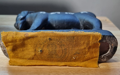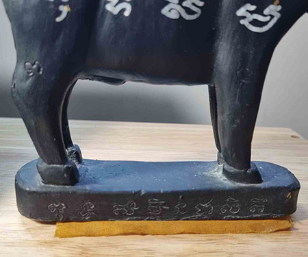 แพะขนาดบูชา ผิวหิ้ง ดูเก่า หลวงพ่อสิน วัดละหารใหญ่ จ.ระยอง (ไม่ทราบรุ่น ไม่ทราบปี) มีจารยันต์ที่ฐาน และตัว ใต้ฐานมีอุดจีวร ปั๊มตราวัด ฐานด้านหน้าเหมือนมีอุดมวลสาร ที่หัวและลำตัวมีรอยเทียนปลุกเสก |