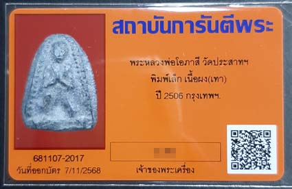 หลวงพ่อโอภาสี วัดประสาทฯ พิมพ์เล็ก เนื้อผง(เทา) ปี2506 กทม. พร้อมบัตรรับรองครับ |