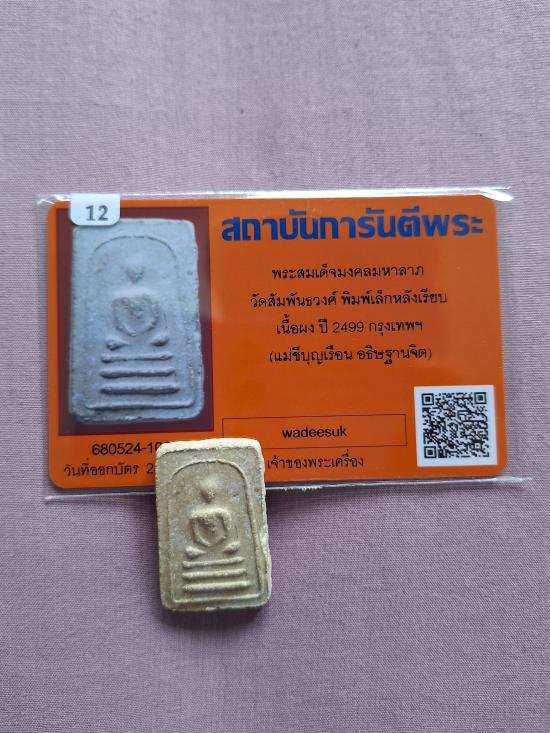 พระสมเด็จมงคลมหาลาภ วัดสัมพันธวงศ์ พิมพ์เล็กหลังเรียบ เนื้อผง ปี 2499 กรุงเทพฯ (แม่ชีบุญเรือน อธิษฐานจิต) |