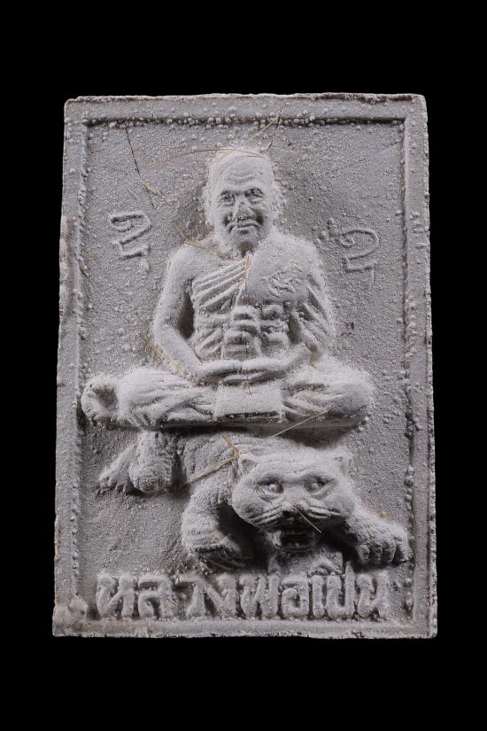 พระผงรูปเหมือนนั่งเสือ หลังเป็นยันต์แม่ทัพ (รุ่นแรก) มีเส้นเกศาด้านหน้าหลายเส้น หลวงพ่อ เปิ่น วัดบางพระ จ.นครปฐม ปี 2534 |