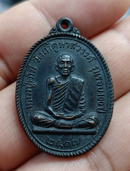 เหรียญหลวงปู่คำมี วัดถ้ำคูหาสวรรค์ จ.ลพบุรี ปี 2517 อายุ 100 ปี เนื้อทองแดงรมดำ |
