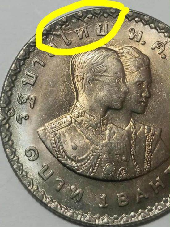 ""เหรียญปั้มพลาดมีภาษาอังกฤษด้านบ้านตามรูปที่วงสีเหลืองไว้"" |