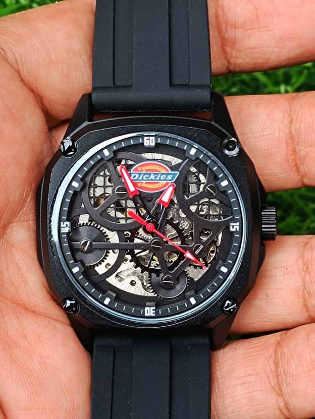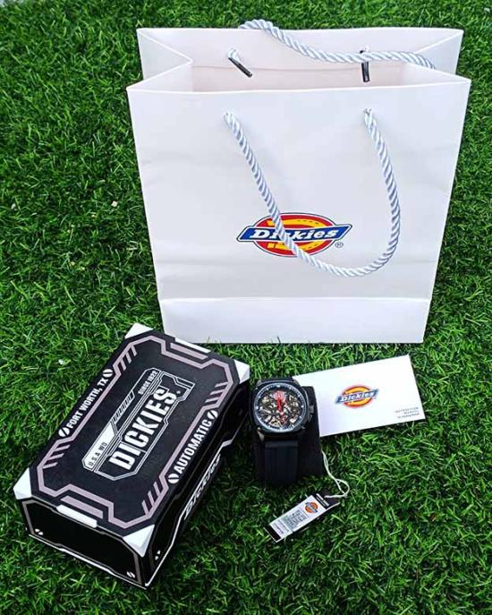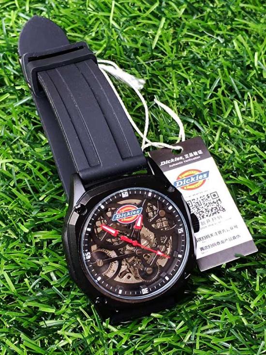 นาฬิกาข้อมือผู้ชาย ยี่ห้อ Dickies สีดำ ยอดนิยม รุ่น 220M60LYXCL-469P1-14JX-A A ขนาดตัวเรือน+เม็ดมะยม 44.4 มม ไม่เคยใช้ ซีลพลาสติกหลังเดิมๆ กล่อง ใบ ถุง ครบ ระบบ mechanical movement กลไกแบบไขลาน สภาพสวยพร้อมใช้งาน เดินปกติ