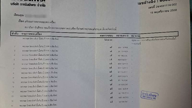 พระองค์นี้นำไปออกบัตรรับรองแล้วผลคือพระเนื้อนี้ยังอยู่ในช่วงสะสมข้อมูลไม่สามารถเอาบัตรได้ แต่ไม่ปลอมนะครับถ้าปลอมทางบริษัทจะระบุเลยว่าพระไม่แท้ |