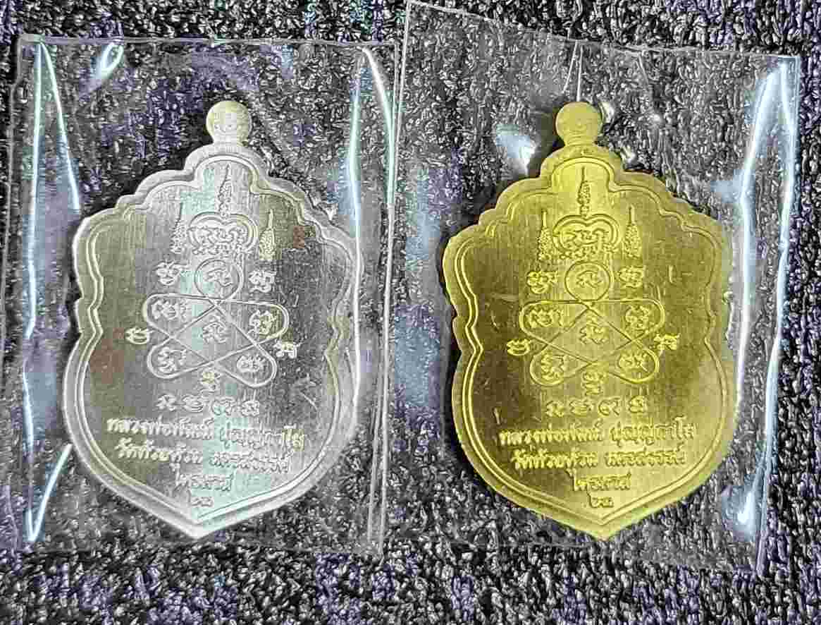 เคาะเดียวแดง เหรียญหลวงพ่อพัฒน์ รุ่นไตรมาส 63 พิมพ์เสมาคาบแก้ว เนื้อฝาบาตร หมายเลข 32 เนื้อพลายเงิน หมายเลข 53 |
