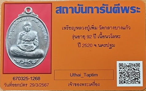 เหรียญฉลองอายุ 92 ปี พรรษา 70 (รุ่นสมัคร) หลวงปู่เพิ่ม วัดกลางบางแก้ว นครปฐม ปี 2520 พระดีปีลึก พร้อมบัตรรับรอง G-Pra
