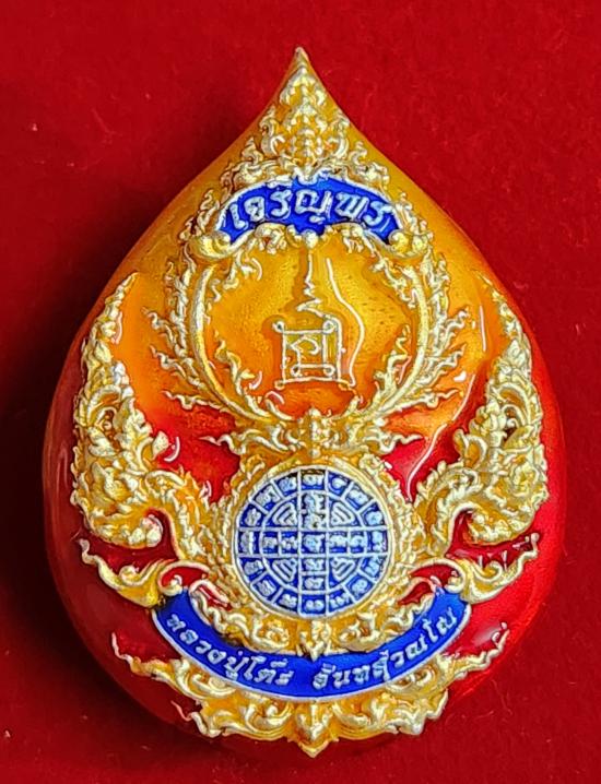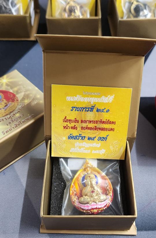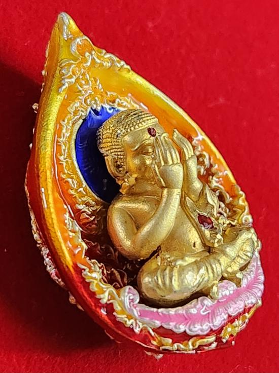 พระปิดตาพุทธศิลป์ รุ่นเจริญพร หลวงปู่โต๊ะ อินทสุวัณโณ วัดถ้ำสิงโตทอง เนื้อชุบเงิน ลงยาลายพระอาทิตย์อัสดงหน้า-หลัง องค์ทอง ฝังพลอยแดงหน้าผาก,สะดือ สร้างเพียง 29องค์(รันเลขรวม) |