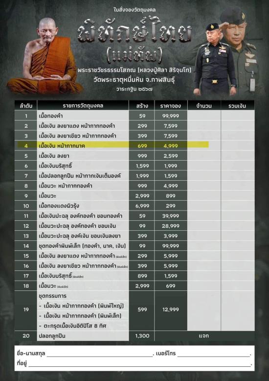 เหรียญ พิทักษ์ไทย ( แม่ทัพภาคที่๒ ) หลวงปู่มหาศิลา สิริจันโท วัดพระธาตุหมื่นหิน จ.กาฬสินธุ์ เนื้อเงิน หน้ากากนาค พิมพ์ใหญ่ ซีนเดิมลุ้นเลขสวย ราคาจอง 4999 บาท |