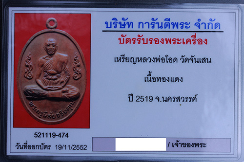 เหรียญหลวงพ่อโอด วัดจันเสน นครสวรรค์ ปี 2519 เนื้อทองแดง พร้อมบัตรรับรอง