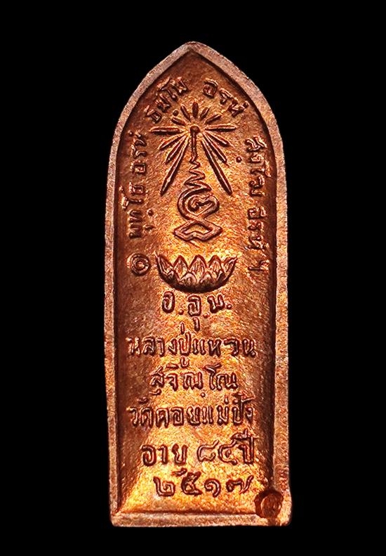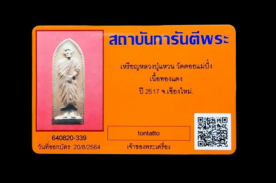 เหรียญรางปืน หลวงปู่แหวน สุจิณโณ เนื้อทองแดง ผิวไฟ ตอกโค๊ต ปี2517 พร้อมบัตรG