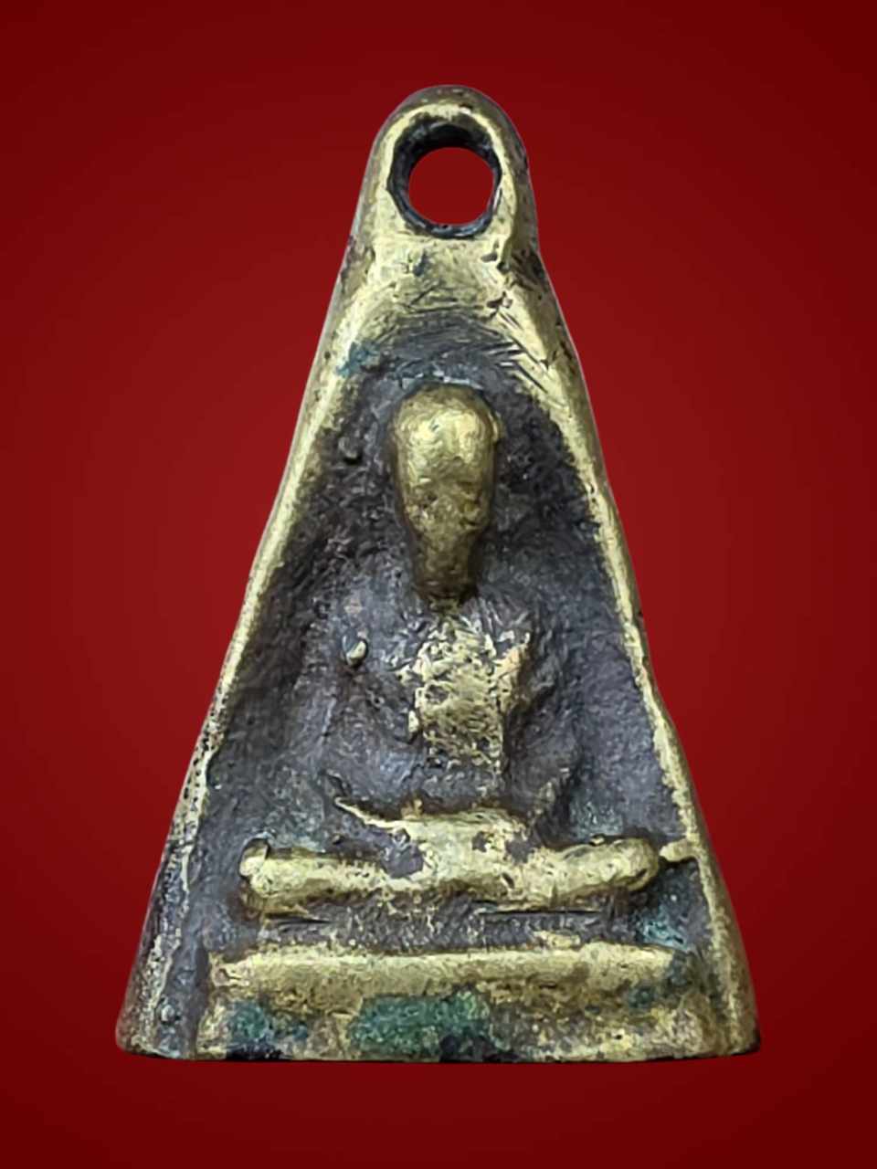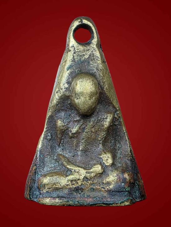 รูปหล่อโบราณระฆังเล็กสองหน้าหัวไม้ขีด หลวงพ่อทบ-หลวงพ่อเขียน พิมพ์เล็ก เนื้อทองเหลือง ออกวัดชนแดน ปี2505