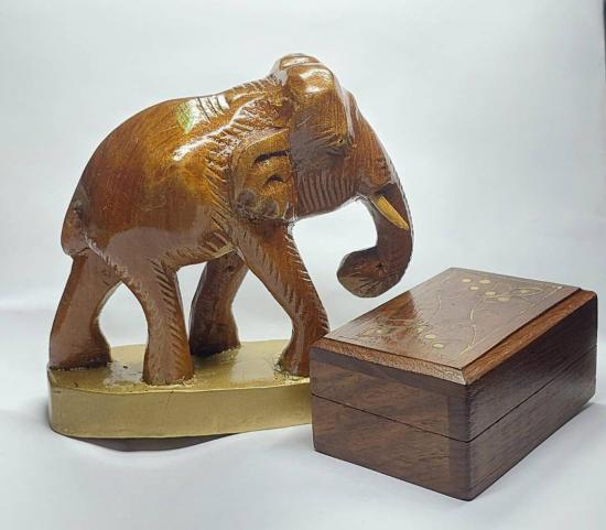 ตลับไม้เล็กขนาด 2*3 นิ้ว กับ ช้างแกะสลักไม้สัก สูง 4 นิ้ว |