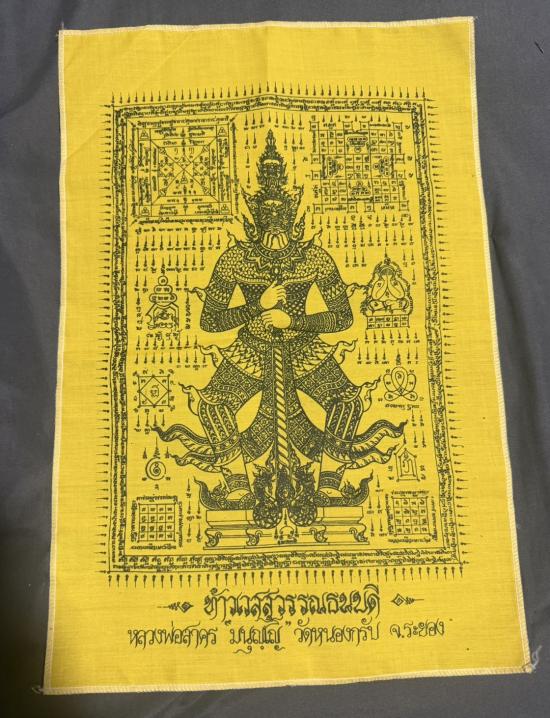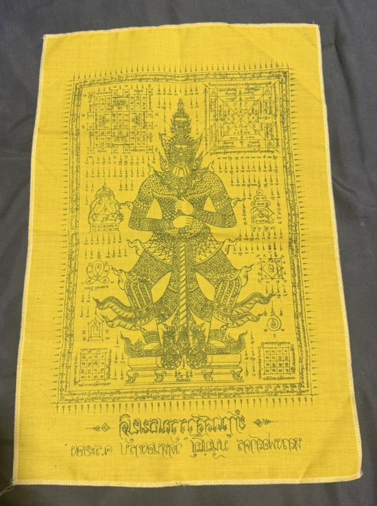ผ้ายันต์สีเหลืองท้าวเวสสุวรรณธนบดี หลวงพ่อสาคร มนุญโญ วัดหนองกรับ สวยเดิมเก็บดี ขนาดประมาณ 12 x 18 นิ้ว |