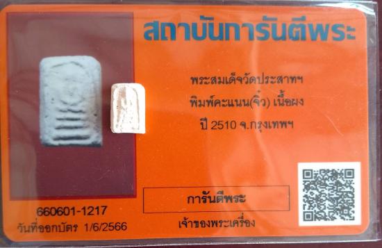 เคาะเดียวแดง.....พระสมเด็จวัดประสาทฯ พิมพ์คะแนน(จิ๋ว) เนื้อผง ปี 2510 กรุงเทพมหานคร พร้อมบัตรรับรองจากสถาบันการันตีพระ |