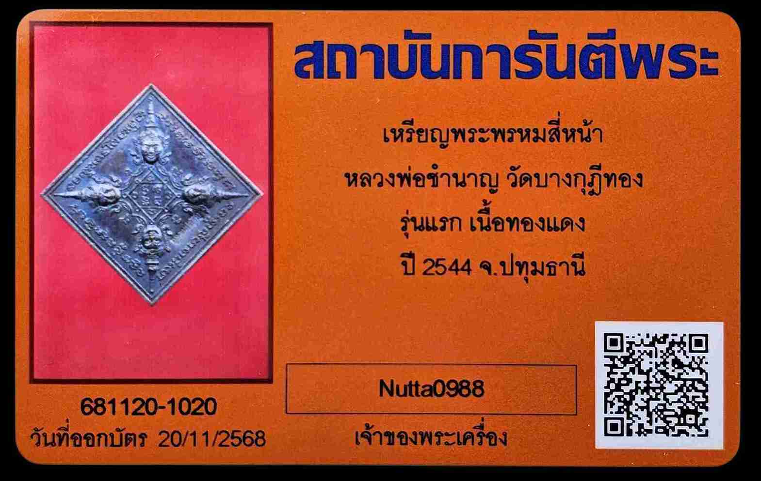 ชื่อพระเครื่อง เหรียญพระพรหมสี่หน้า รุ่นแรก หลวงพ่อชำนาญ วัดบางกุฎีทอง ปี 2544 เนื้อทองแดง ผิวรุ้งๆ