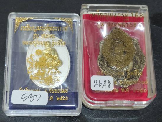 ชื่อพระเครื่อง **เคาะเดียว2เหรียญ** หลวงปู่หมุน เหรียญมนต์พระกาฬ ชนะจน เนื้อเปียกเงินพ่นทรายหน้ากากทองทิพพ์ เหรียญมังกรคู่168 รุ่นปลดหนี้168 หลวงปู่หมุน ฐิตสีโล ออกวัดบ้านจาน ปี 2566 เนื้อทองทิพย์ซาติน