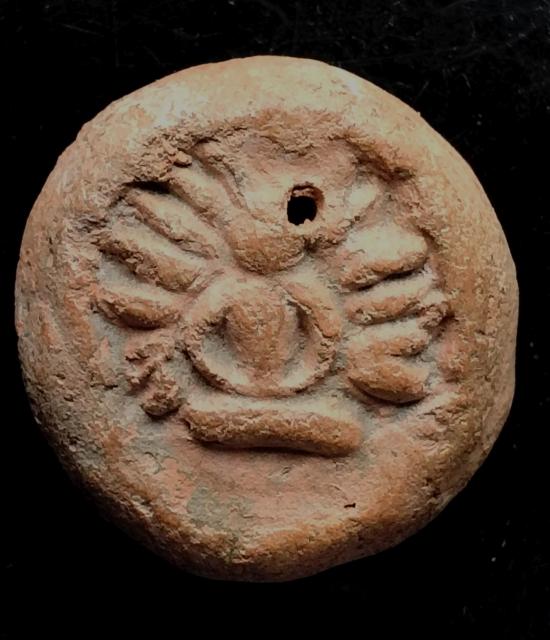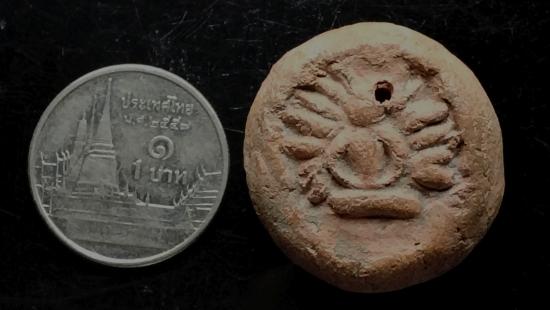 พระจันลอยเนื้อดินเจาะรูหลังมีรอยจารไม่ทราบที่ |