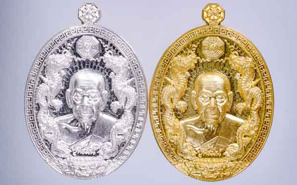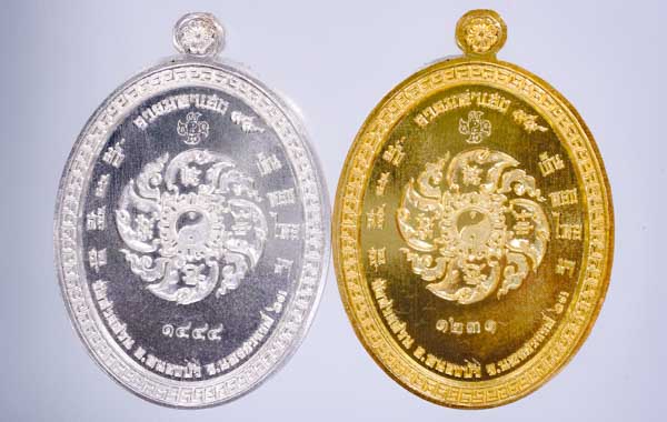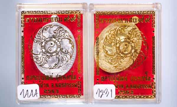*กะหลั่ยพ่นทราย ทีเดียว 2 องค์ สวยคม วัดใจ เหรียญรุ่น รวยมหาเฮง 99 หลวงพ่อพัฒน์ วัดห้วยด้วน ด้านหลังจักร สวยมาก เคาะเดียวแดง*