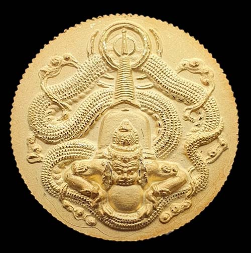 เหรียญองค์พ่อจตุคาม รุ่น รวยไม่เลิก เหรียญแจกศูนย์จอง ชุบทองพ่นทราย ลงยาแดง ขนาด 3.2 ซม. ไม่มีกล่อง |