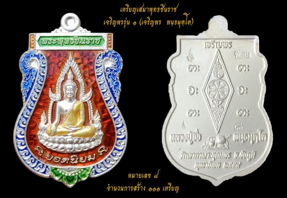 เหรียญเสมาพุทธชินราช เนื้อเงินลงยาราชาวดี หลังยันต์ ตอกพิเศษ หลวงปู่จื่อ วัดเขาตาเงาะอุดมพร ปี๒๕๕๙ เจริญพรรุ่น ๑ (เจริญพร พนฺธมุตฺโต) หมายเลข ๘ จำนวนการสร้ง ๑๑๑ เหรียญ พระสวยแชมป์ เลขรวยสวยเทพ