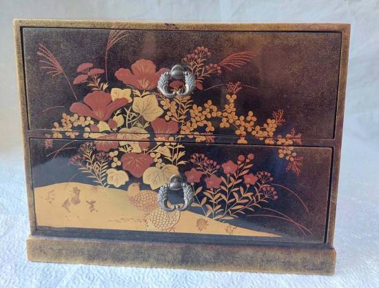 เป็นงานเครื่องเขิน งานเก่าญี่ปุ่นแท้ สีสนิมแดงไม้เก่างานนอกมือสองขนาด กว้าง 9.5 นิ้ว สูง 7.7 นิ้ว ลึก 7.7 นิ้ว ดีเทลจากญี่ปุ่น ผลิตในญี่ปุ่นสภาพดี |