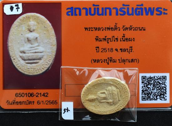 เคาะเดียว พระหลวงพ่อติ้ว วัดหัวถนน พิมพ์รูปไข่ เนื้อผง ปี 2518 จ.ชลบุรี (หลวงปู่ทิม ปลุกเสก) + บัตรรับรองพระแท้การันตีพระ |