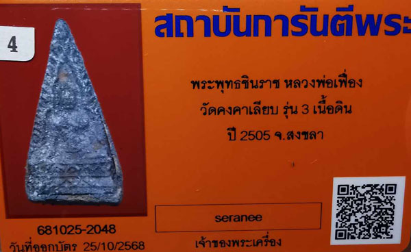 พระพุทธชินราช หลวงพ่อเฟื่อง วัดคงคาเลียบ รุ่น3 เนื้อดิน ปี2505 จ.สงขลา + บัตรG-pra สภาพเดิมค่ะ |