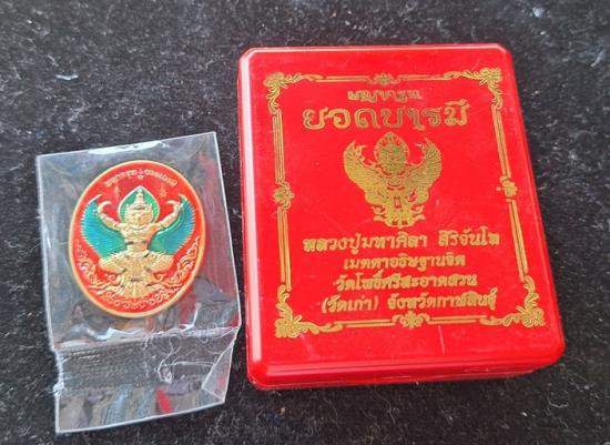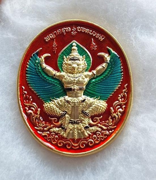 เหรียญพญาครุฑ หลวงปู่ศิลา วัดโพธิ์ศรีสะอาด รุ่นยอดบารมี ลังนำฤกษ์ เนื้ออาบทองโบราณ ลงยาทรงเครื่อง ลงยาปีกครุฑ พื้นแดง No.5