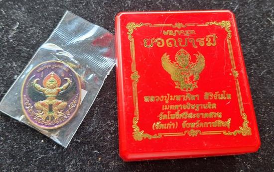 เหรียญพญาครุฑ หลวงปู่ศิลา วัดโพธิ์ศรีสะอาด รุ่นยอดบารมี ลังนำฤกษ์ เนื้อฝาบาตรโบราณ ลงยาทรงเครื่อง ลงยาปีกครุฑ พื้นม่วง No.53 |