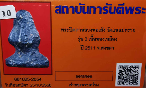 พระปิดตาหลวงพ่อเส้ง วัดแหลมทราย รุ่น3 เนื้อทองเหลือง ปี2511 จ.สงขลา + บัตร G-pra สภาพเดิมค่ะ |