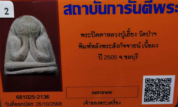 พระปิดตาหลวงปู่เฮี้ยง วัดป่าฯ พิมพ์หลังพระสังกัจจายน์ เนื้อผง ปี2505 จ.ชลบุรี + บัตรG-pra สภาพสวยเดิมค่ะ |