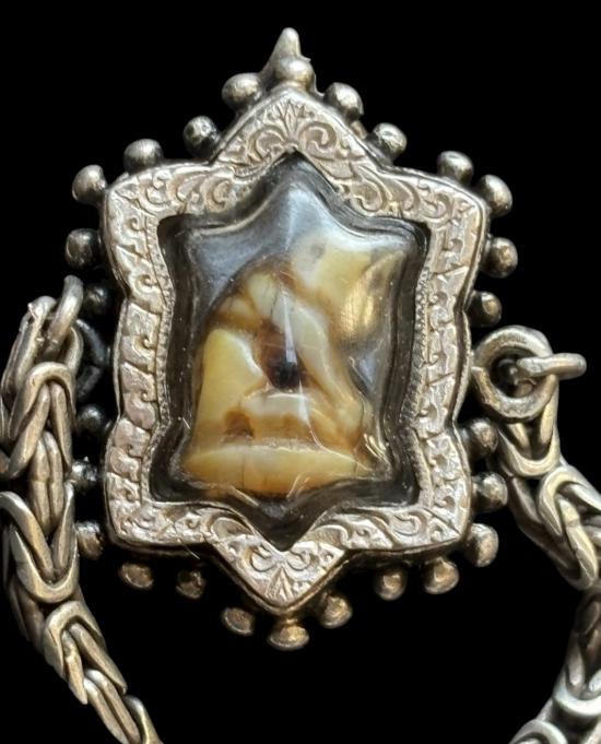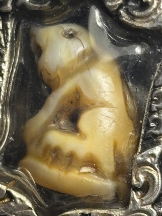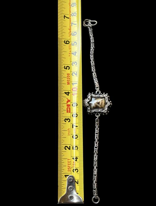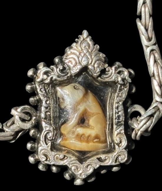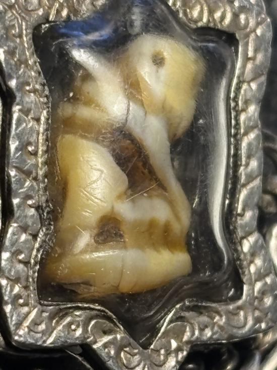 เขี้ยวเสือไม่ทราบที่มีรอยจาร มาพร้อมสร้อยข้อมือตลับเงินสั่งทำ มาพร้อมสร้อยข้อมือตลับเงินรมดำเม็ดไข่ปลาข้างเงินสั่งทำ ความยาว 7 นิ้ว