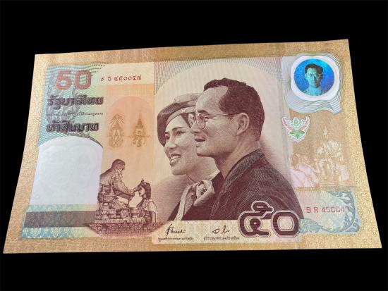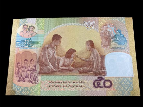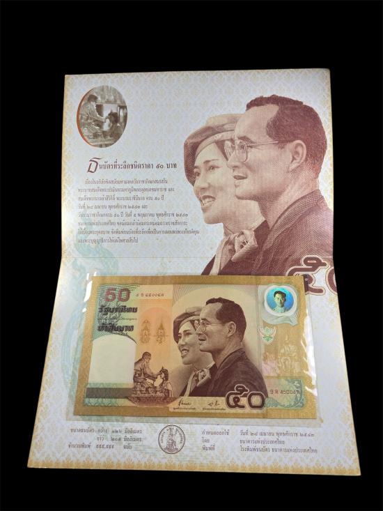 ธนบัตรที่ระลึกชนิดราคา 50 บาท เนื่องในอภิลักขิตสมัยมหามงคลวันราชาภิเษกสมรส ครบ 50 ปี 28 เมษายน 2543 และวันบรมราชาภิเษกครบ 50 ปี 5 พฤษภาคม 2543 สวยๆ ครับ |